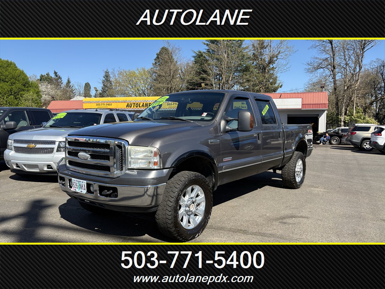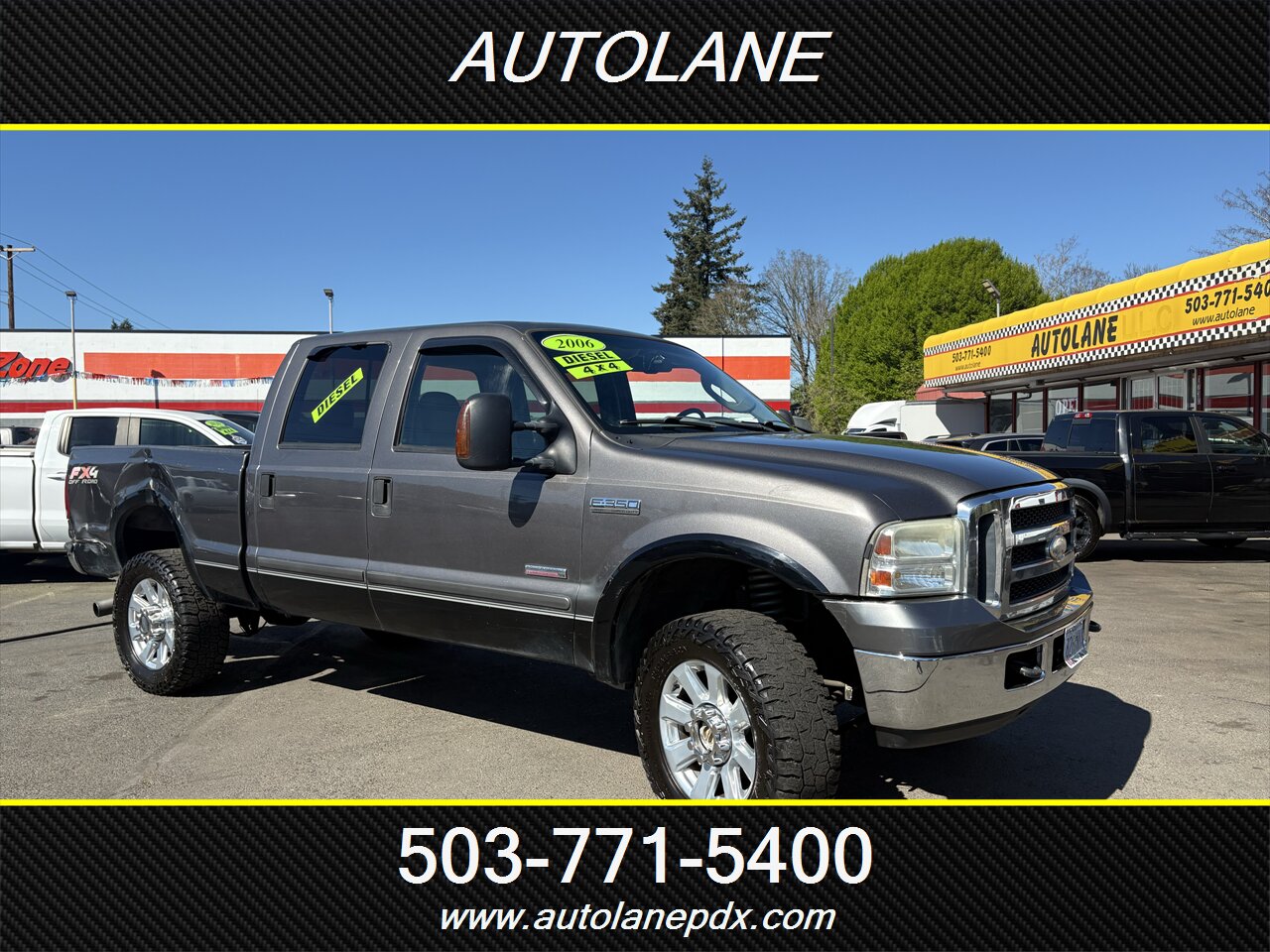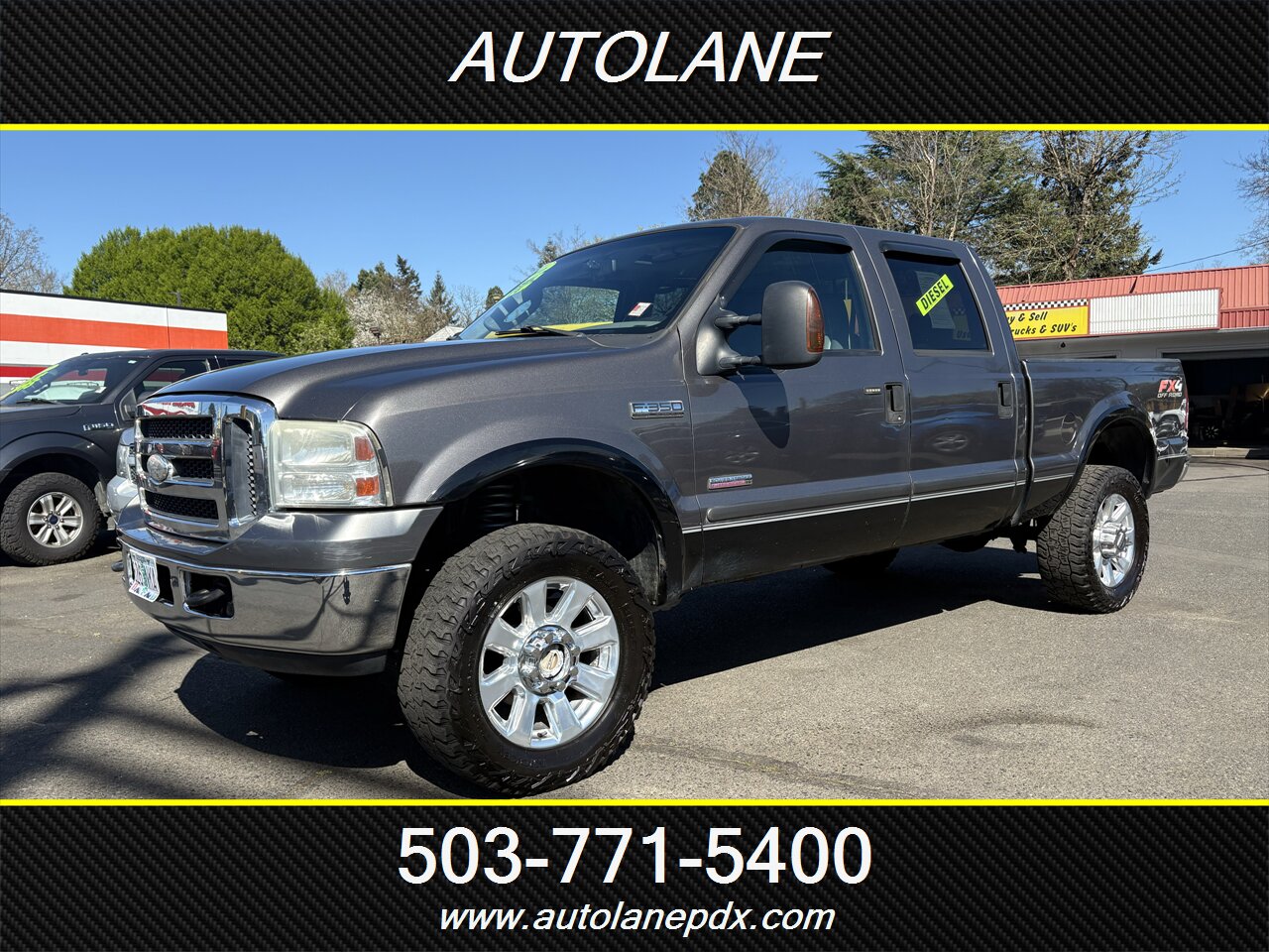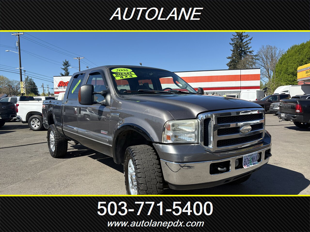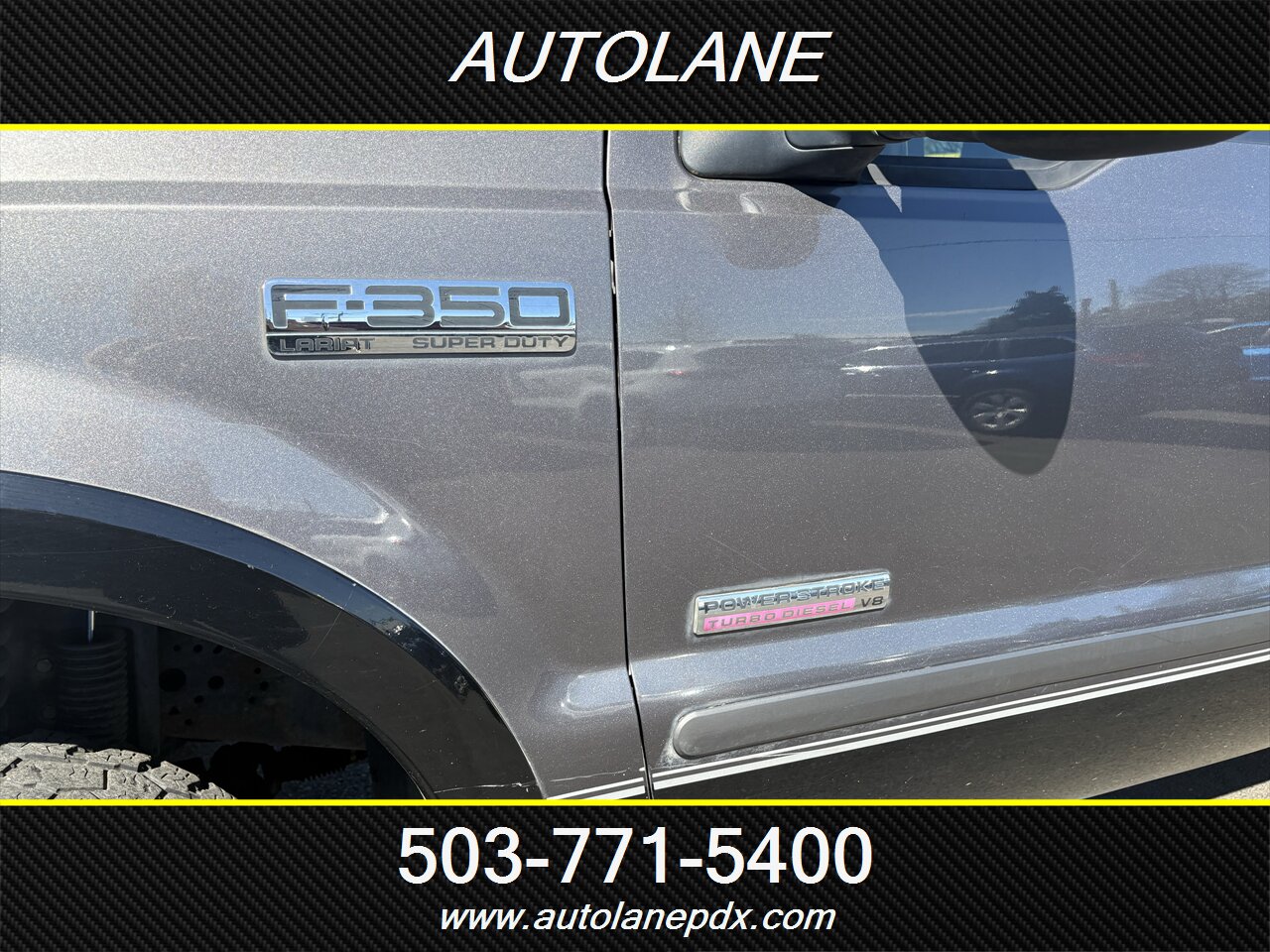 2006 Ford F-350 Super Duty Lariat in Dark Shadow Grey Clearcoat Metallic, powered by a Power Stroke 6.0L Diesel Turbo V8 (325 hp, 560 ft-lb). Factory equipment includes heavy-duty frame and suspension, upgraded Lariat exterior trim with chrome accents, power mirrors (heated), power windows and locks with remote keyless entry, cruise control, tilt steering, and an automatic TorqShift transmission. Interior in Medium Flint vinyl features durable vinyl seating, air conditioning, AM/FM/CD audio, dual front airbags, ABS brakes and factory heavy-duty towing provisions (receiver hitch and wiring).