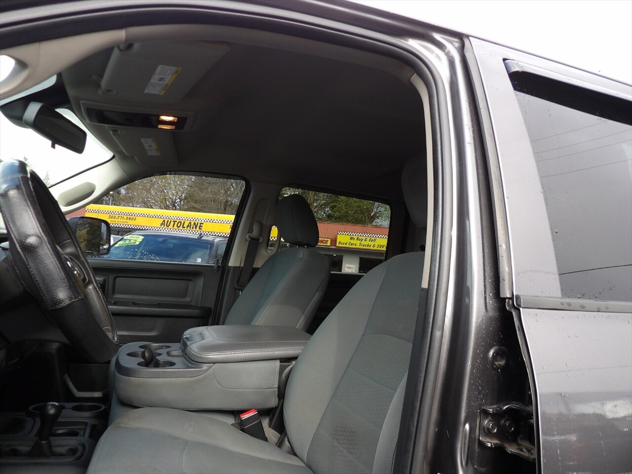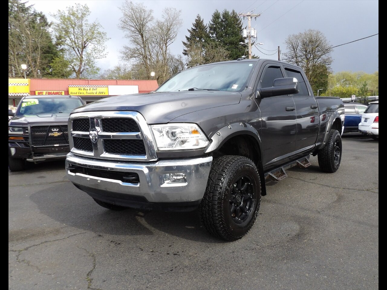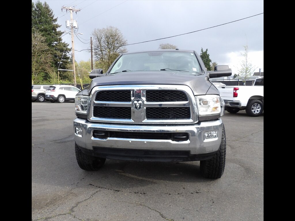2015 RAM 2500 Tradesman in Gray with a matching Gray interior, powered by the Cummins 6.7L Turbo Diesel I6 producing 350 hp and 660 lb-ft of torque; vehicle is in excellent overall condition. Factory equipment emphasizes heavy-duty capability and durability and includes the turbo-diesel paired with a heavy-duty automatic transmission, reinforced frame and suspension tuned for towing and payload, anti-lock brakes with stability and traction control, airbags, basic AM/FM audio with auxiliary input, durable gray upholstery and rubberized flooring, 17-inch steel wheels, halogen headlamps, factory tow prep (hitch receiver and wiring), tow/haul mode and standard power steering and exterior mirrors. This Tradesman is configured for work-ready reliability with the essential factory features intended for commercial and towing use.