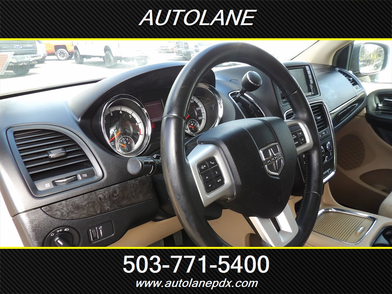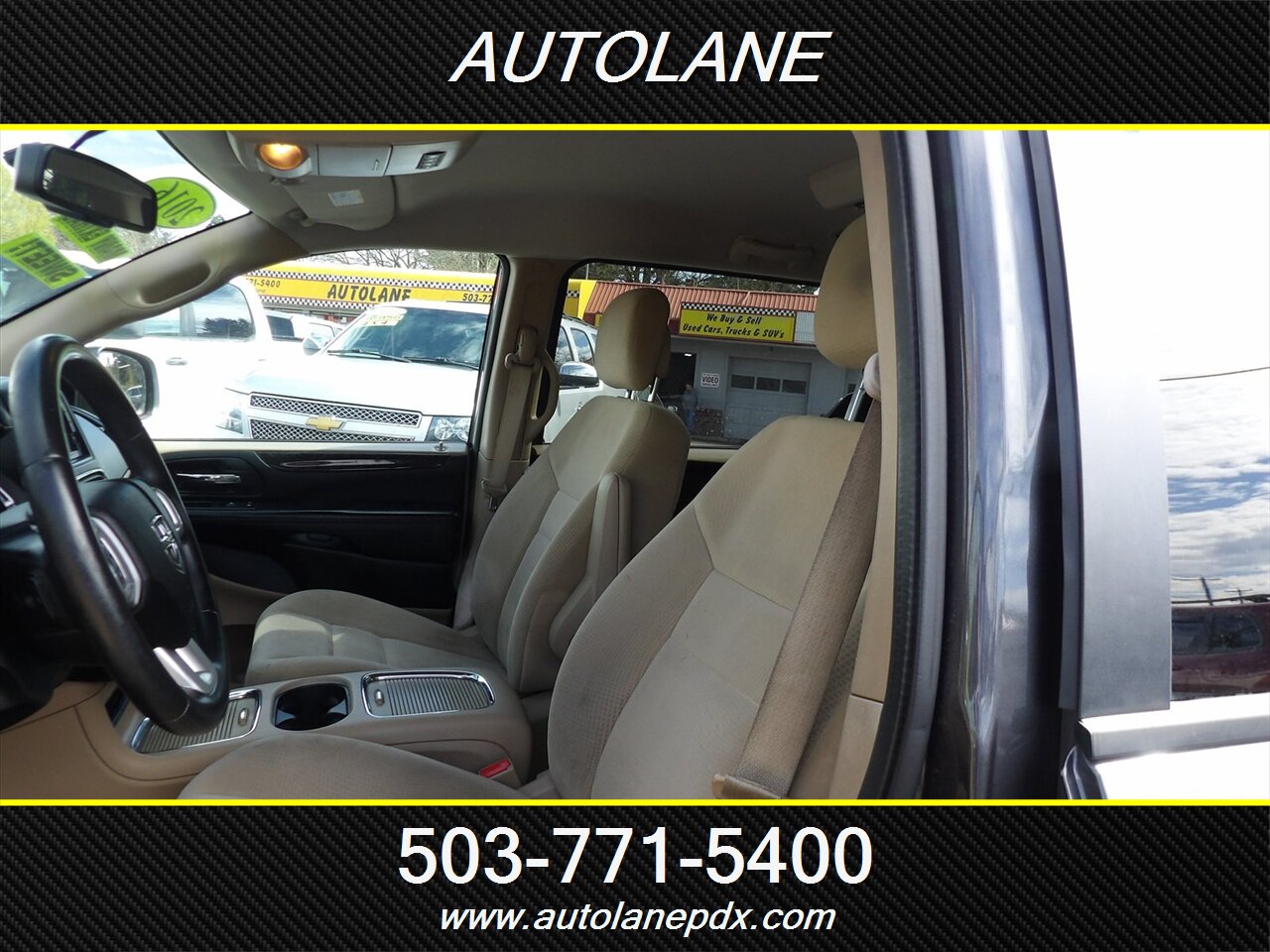 2016 Dodge Grand Caravan SXT finished in Granite Crystal Metallic Clear Coat with a tan interior, powered by the Pentastar 3.6L FlexFuel V6 (283 hp, 260 lb-ft) and a 6-speed automatic transmission. Factory standard equipment includes Stow ’n Go second- and third-row seating that folds into the floor for flexible cargo/passenger configurations, 17-inch wheels, power windows and door locks, remote keyless entry, cruise control and a tilt steering column. Comfort and convenience features include an AM/FM stereo with CD/MP3 playback, Bluetooth hands-free and audio streaming, USB/AUX inputs, rearview camera, multi-zone climate controls with rear vents, and safety systems such as ABS, electronic stability and traction control, tire pressure monitoring and front/side/curtain airbags.