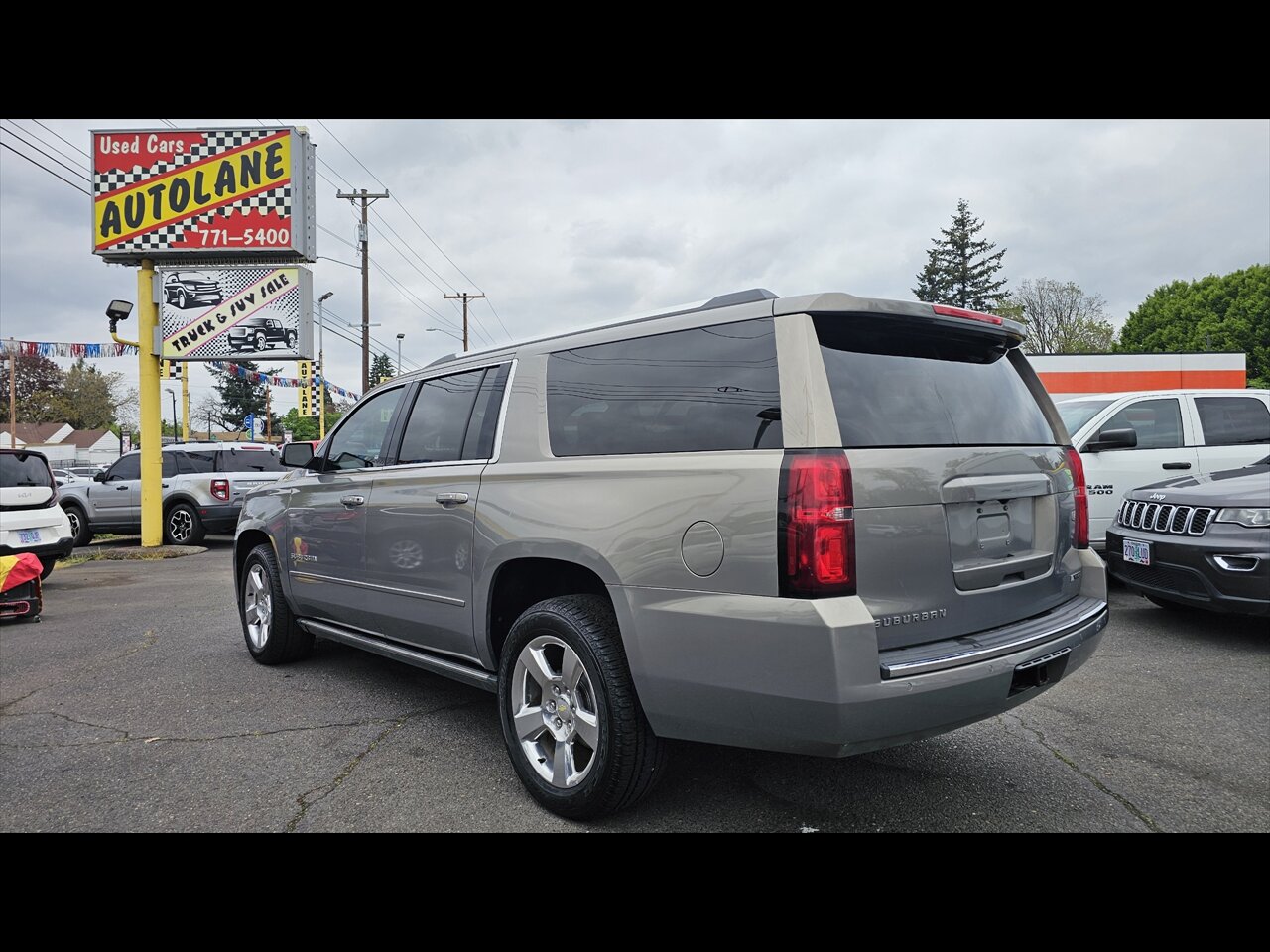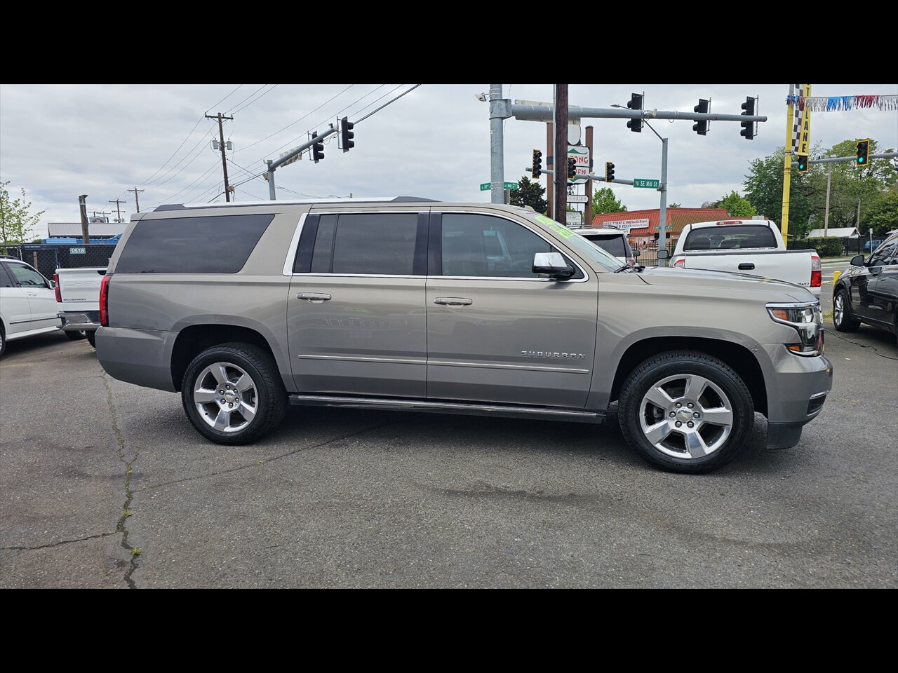 2017 Chevrolet Suburban Premier in Champagne Silver Metallic with a Jet Black leather-appointed interior. Powered by the EcoTec3 5.3L FlexFuel V8 delivering 355 hp and 383 lb-ft of torque. Factory-standard equipment on the Premier includes leather seating with heated and ventilated front seats, power-adjustable front seats with driver memory, heated steering wheel, power-folding third-row seats and a power liftgate; tri-zone automatic climate control and rear HVAC controls; keyless entry with push-button start and remote start. Infotainment and safety features include a touchscreen infotainment system with Bluetooth, satellite navigation and premium audio, OnStar with available 4G LTE Wi-Fi, rearview camera, rear parking sensors, blind-spot monitoring with rear cross-traffic alert, ABS and StabiliTrak electronic stability control.